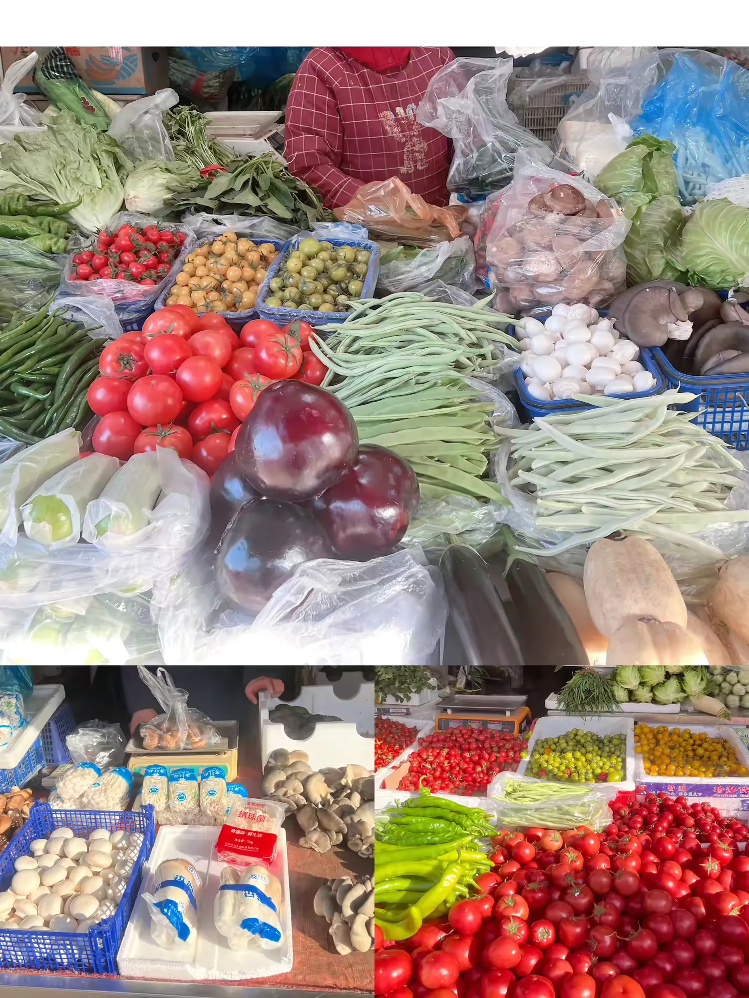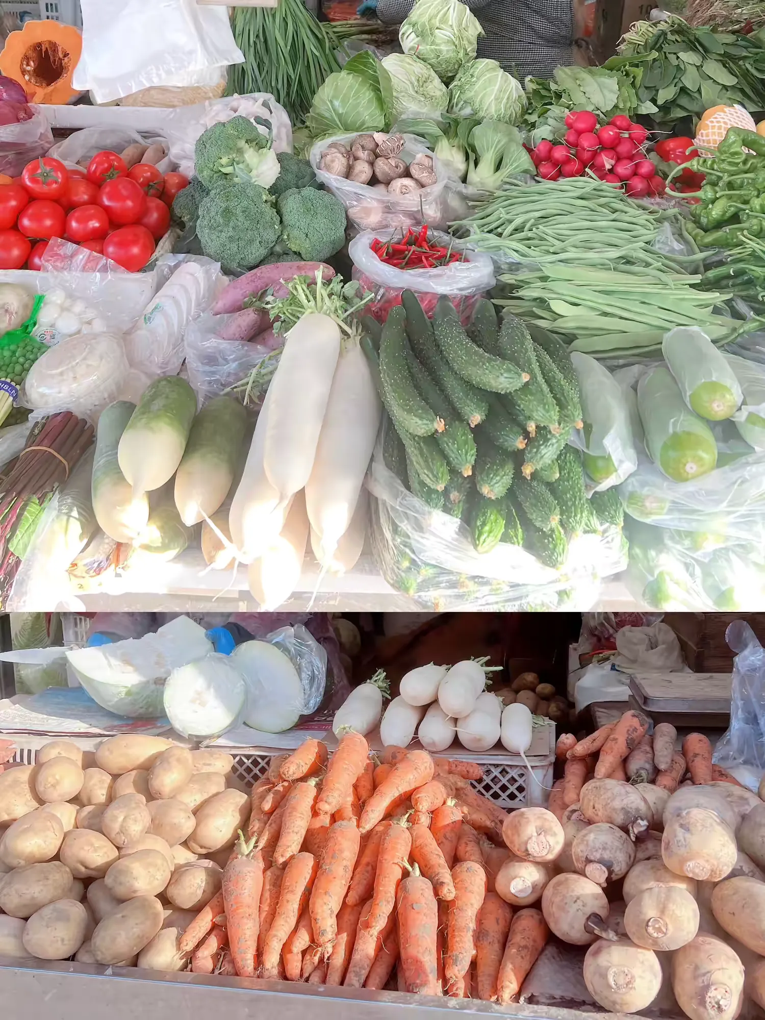 新鲜蔬菜区宛如一片五彩斑斓的田园,生机盎然。红彤彤的西红柿圆润饱满,像一个个小灯笼;翠绿的豆角、黄瓜鲜嫩欲滴,带着清晨的露水;洁白的萝卜、圆润的土豆堆成小山,西兰花、菜花排列整齐,还有红得耀眼的辣椒、紫得发亮的茄子,各类时令蔬菜应有尽有。这里的蔬菜新鲜直供,物美价廉,让家家户户的年夜饭餐桌,都能摆满清爽可口的时令鲜味。