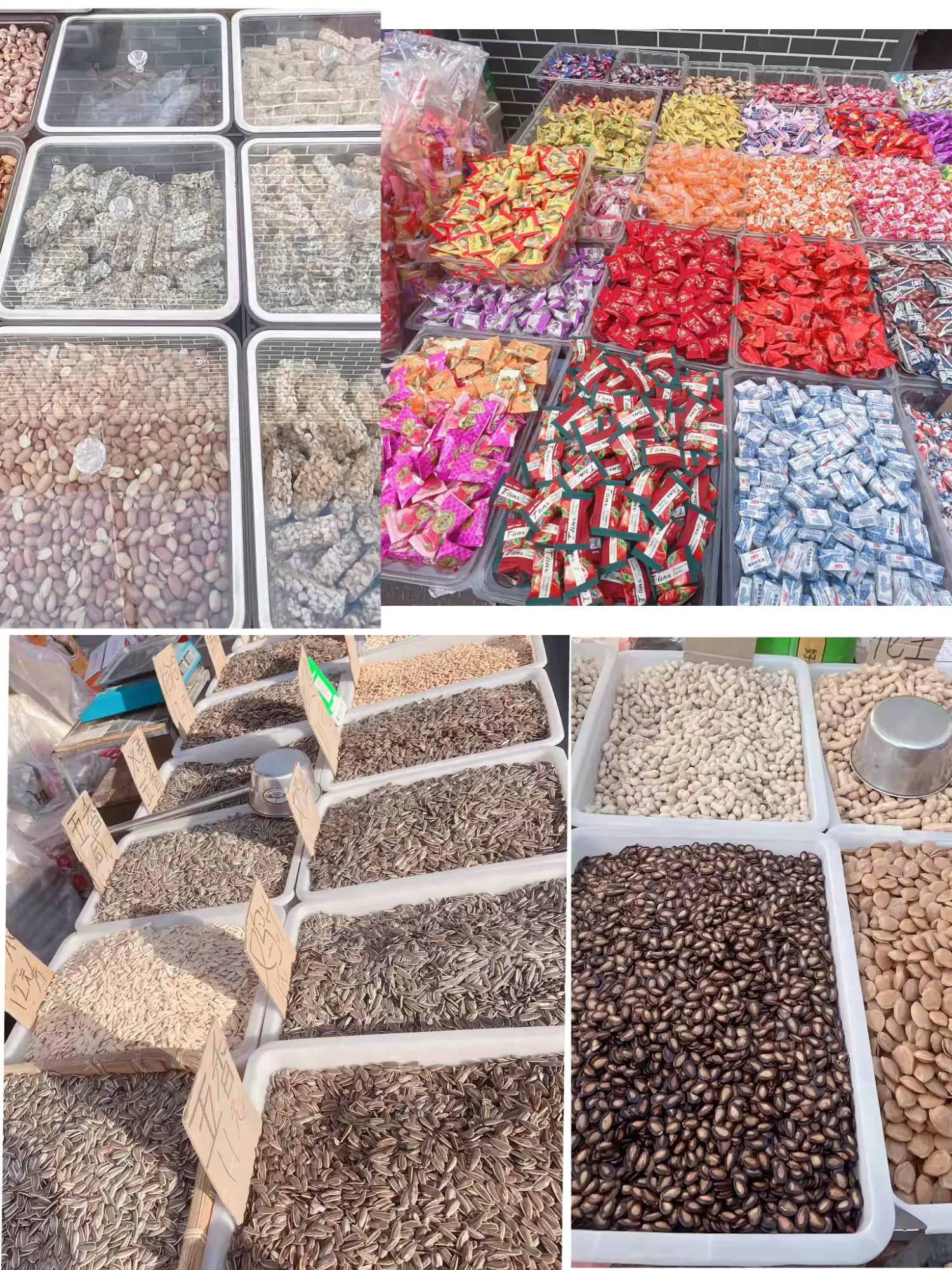 干货零食区,是新春欢聚的“快乐源泉”。各式各样的瓜子铺满摊位,葵花籽、西瓜子、南瓜子粒粒饱满,炒得香脆;花生、开心果、巴旦木等坚果分门别类,新鲜醇香。糖果区更是色彩缤纷,奶糖、水果糖、巧克力糖满满当当,包装喜庆,甜香四溢。一把瓜子,几颗糖果,便是新春里亲友相聚、闲话家常的最佳搭配。